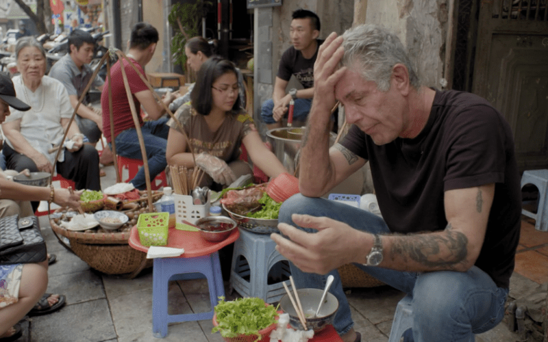 Hình ảnh ông Bourdain thưởng thức món ăn vỉa hè Hà Nội trong tập đầu của mùa 8 chương trình “Anthony Bourdain: Parts Unknown”. Đầu bếp Mỹ đã đưa ẩm thực Việt Nam nói chung và món ăn đường phố Hà Nội nói riêng tới gần hơn với bạn bè quốc tế. Có lẽ, chẳng hề nói quá khi cho rằng, ông Bourdain là người sành sỏi văn hoá ẩm thực đường phố Việt Nam, không thua gì người bản địa.