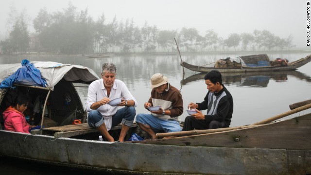 Vị đầu bếp nổi tiếng của Mỹ ăn cùng ngư dân trên thuyền ở một khu chợ nổi ở thành phố Huế. Hình ảnh được phát sóng trong một tập của chương trình truyền hình “Anthony Bourdain: Parts Unknown” năm 2014. Cũng trong kỳ phát sóng này, ẩm thực Việt làm “say lòng” vị đầu bếp nổi tiếng. Ông Bourdain đặc biệt ấn tượng với ẩm thực Huế, với bún bò, cơm hến, bánh bèo, bánh bột lọc… Ông thích thú với ẩm thực đường phố và những hàng quán bình dân nơi đây.