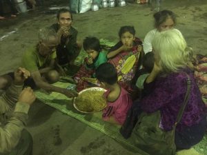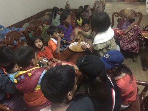 Những đứa trẻ tranh nhau ăn mì tôm cứu trợ.
