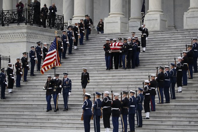 Lính danh dự ngày 5/12 đưa linh cữu cố tổng thống rời khỏi tòa nhà quốc hội Mỹ để đến Nhà thờ Quốc gia, nơi tổ chức tang lễ vào 11h giờ miền đông Mỹ (23h giờ Hà Nội).