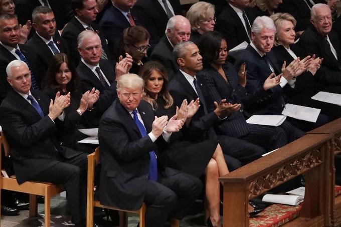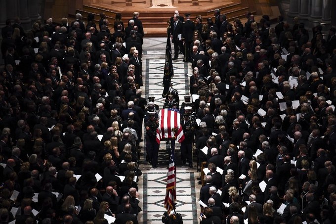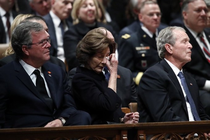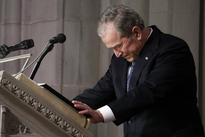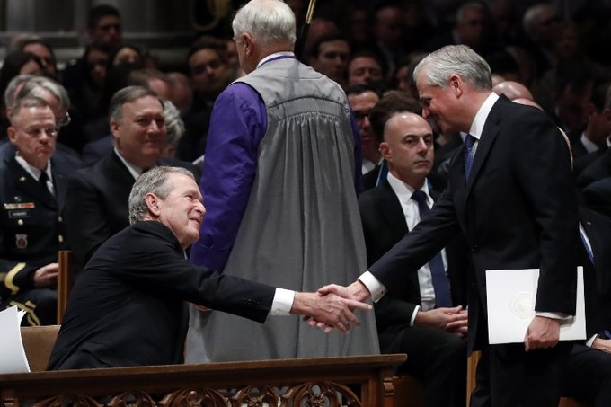 Sử gia Jon Meacham, người đầu tiên đọc điếu văn trong tang lễ, bắt tay George W. Bush. Meacham đã kể lại câu chuyện cố tổng thống Bush từng bị bắn rơi ở Thái Bình Dương khi là phi công trong Thế Chiến II và nhấn mạnh ông có “trái tim của sư tử”.