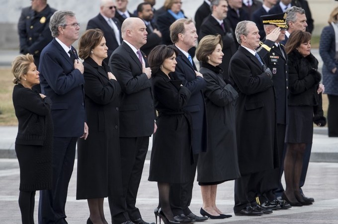 Các thành viên gia đình ông Bush xếp thành một hàng, đặt tay lên ngực khi linh cữu được di chuyển.