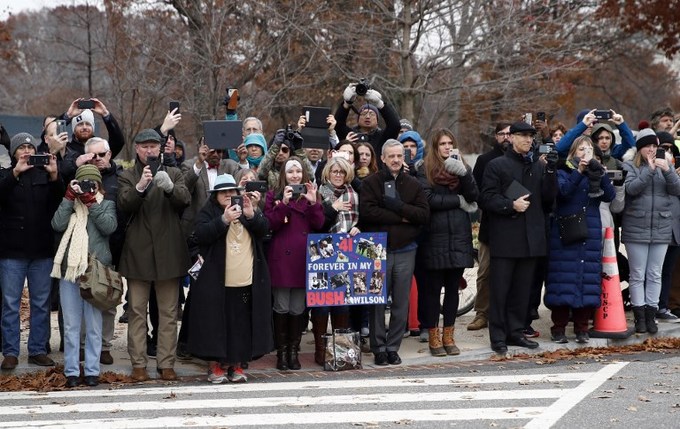 Người dân đứng dọc theo Đại lộ Pennsylvania để chứng kiến đoàn xe chở linh cữu đi qua. Một phụ nữ cầm tấm bảng có dòng chữ “Tổng thống thứ 41 của nước Mỹ - luôn luôn trong trái tim tôi”.