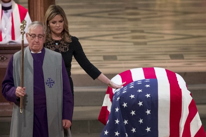Jenna Bush Hager, cháu của cố tổng thống Bush, đặt tay lên linh cữu ông sau khi cô lên bục phát biểu để đọc Kinh thánh.