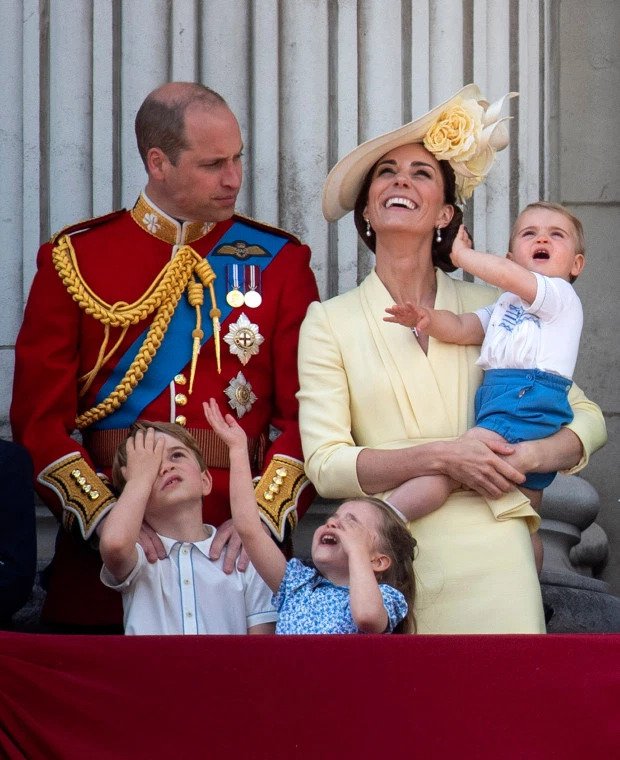 William và Kate cùng các con gồm Hoàng tử Louis, Hoàng tử George, và Công chúa Charlotte, trên ban công của Lâu đài Buckingham.