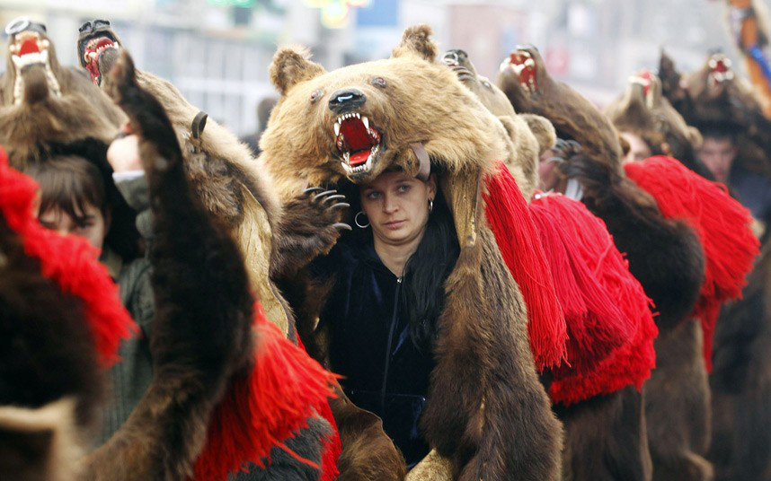 Nhảy múa trong lớp da gấu thật là một trong những nghi thức diễn ra trong lễ mừng năm mới của người Romania. Những người tham gia diễu hành sẽ phải mặc một lớp da gấu thật, nhảy múa và diễn cảnh lăn lộn đến “chết” trước khi trở lại khỏe mạnh. Theo quan niệm của người Romania, nghi thức này báo hiệu cho một mùa xuân đang tớ, giúp xua đuổi ma quỷ, mang lại may mắn.