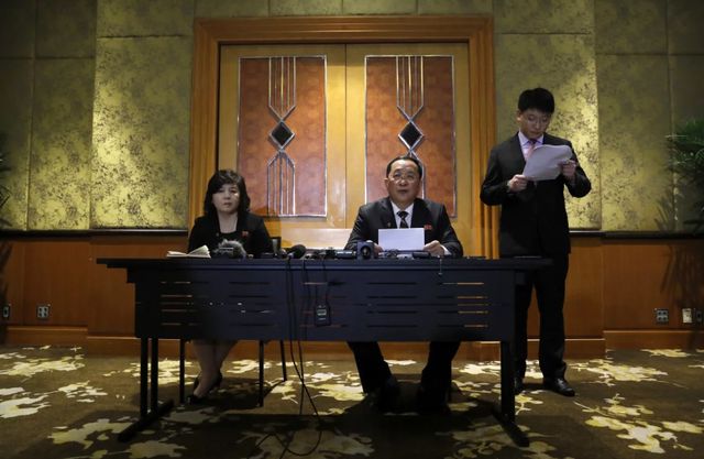 Bà Choe Son-hui cũng trả lời truyền thông quốc tế trong cuộc họp báo lúc 0h của phái đoàn Triều Tiên tại khách sạn Melia, sau Hội nghị Thượng đỉnh Mỹ - Triều không đạt được thỏa thuận chung. (Ảnh: Bloomberg)