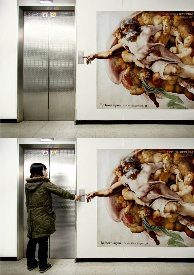 Kiệt tác Sự tạo dựng Adam của Michelangelo được bác sĩ Kim tận dụng quảng cáo cho phòng phẫu thuật thẩm mỹ với khẩu hiệu: “Bấm vào thang máy là bạn được sinh ra thêm lần nữa”.