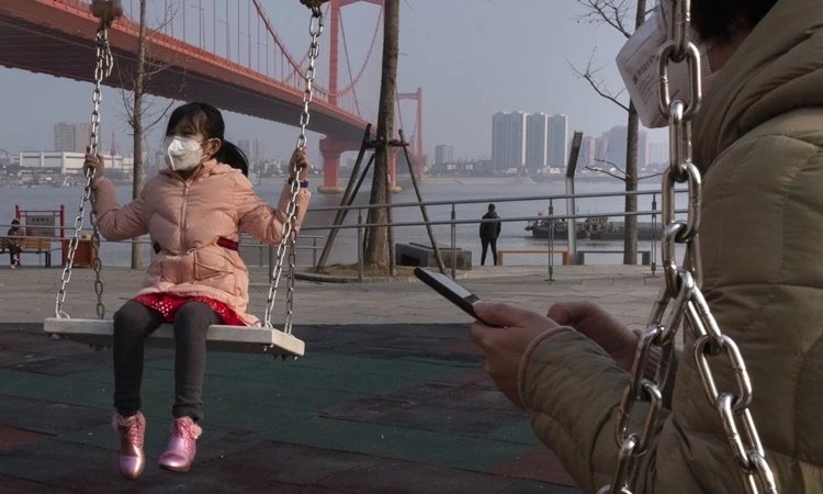 Một bé gái đeo khẩu trang chơi xích đu bên sông Dương Tử ở Vũ Hán. Ảnh: AP.