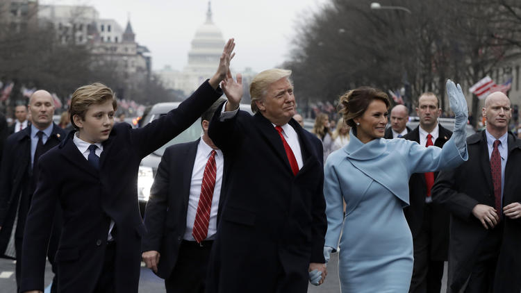 Tổng thống Donald Trump cùng vợ Melania Trump và con trai Barron diễu hành ở Washington, DC. vào ngày ông Trump nhậm chức 20/1/2017. Ảnh: AP