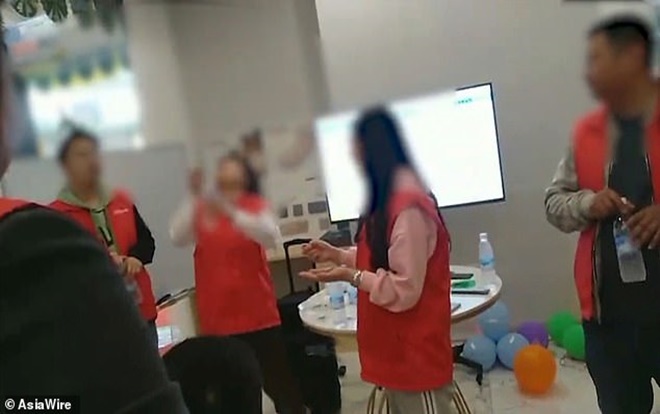 Các thành viên thuộc nhóm bán hàng của công ty xuất hiện trong đoạn clip tham gia một cuộc họp nhân viên khi họ nhận hình phạt tàn khốc này .