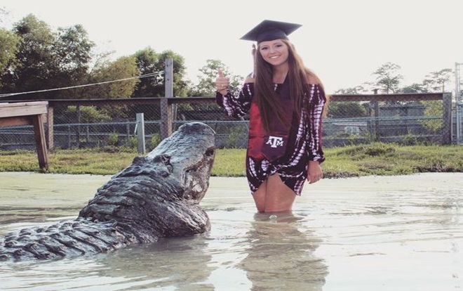 Makenzie Noland, 21 tuổi, tốt nghiệp đại học Texas A & M tuần này. Cô nàng đã nảy ra một ý định táo bạo đó là tổ chức lễ tốt nghiệp của mình bằng cách tiếp cận, gần gũi và chụp ảnh lưu niệm với một con cá sấu dài gần 4 m.