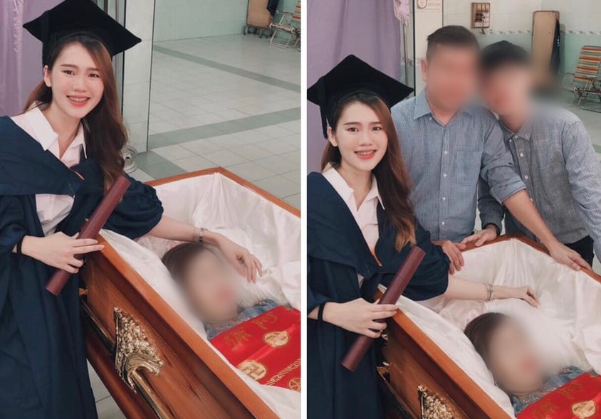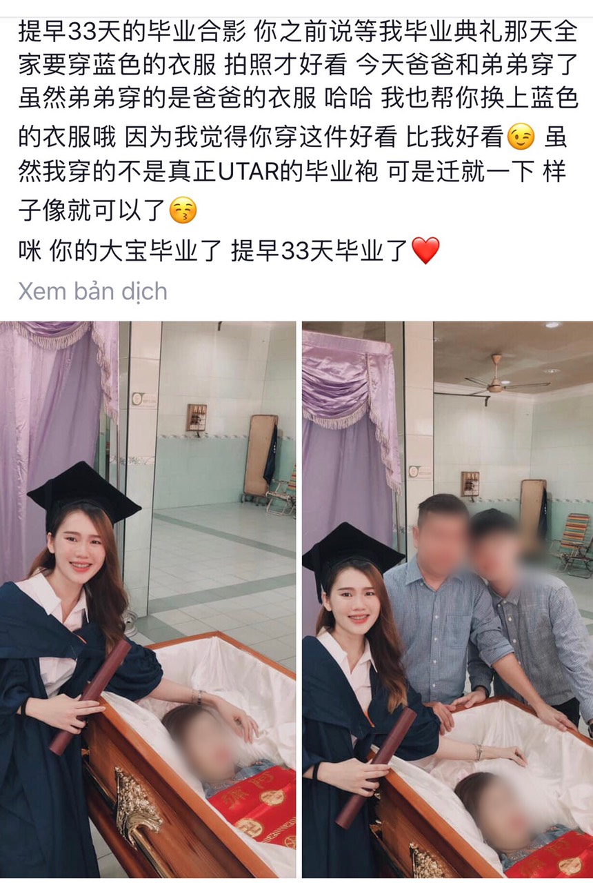 Bức hình cô trong chiếc áo thụng mặc sớm 33 ngày bên cạnh người mẹ đang yên nghỉ trong chiếc quan tài thật sự khiến nhiều người phải rơi nước mắt.
