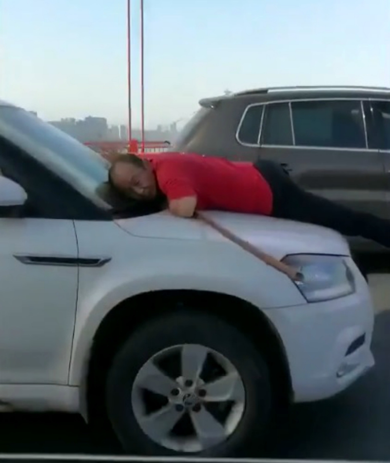 Video người đàn ông bám chặt đầu xe suốt 13 km.