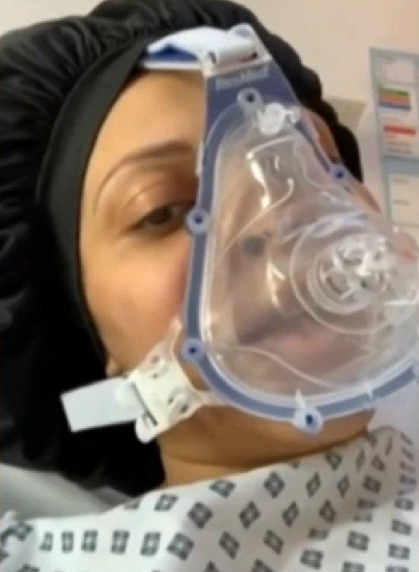 Michelle Wright, 37 tuổi, có lẽ gặp khó trong khi thở khi cố gắng trò chuyện với mọi người qua video trong khi đang đeo mặt nạ dưỡng khí.