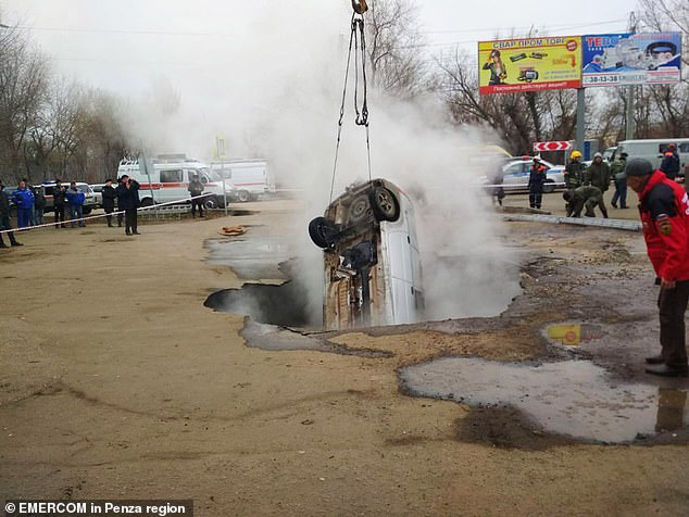 Vụ tai nạn thương tâm xảy ra tại Penza, Nga. Khi hai nạn nhân xấu số còn chưa kịp lái xe ra khỏi bãi đỗ, đường ống nước nóng dưới lòng đất đột ngột vỡ toang khiến nền đất sụp xuống thành một cái hố lớn, kéo theo cả hai cùng chiếc xe Lada Largeus của họ xuống dòng nước bỏng rát 75°C.