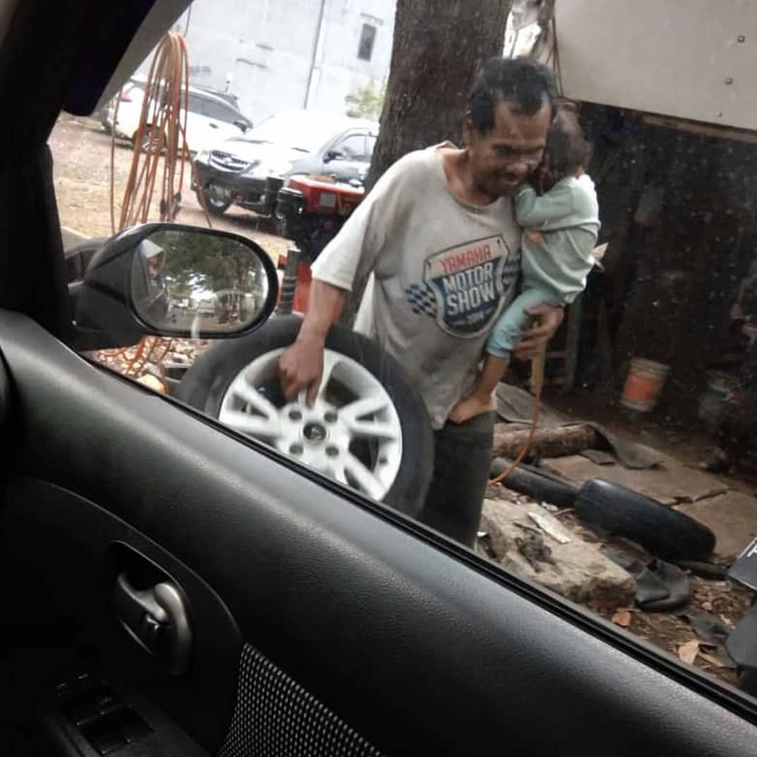 Vì làm thợ vá lốp xe nên người cha gà trống nuôi con phải di chuyển liên tục. Song, ông nhất quyết không để con gái rời xa vòng tay chăm sóc của mình. Đối với ông, bỏ mặc con bơ vơ, thiếu thốn tình thương của cả bố lẫn mẹ chính là tội ác. Sau khi hoàn thành công việc, ông tháo bỏ miếng vải quấn tạm làm chiếc địu, sau đó ôm con gái trong tay để giúp bé dễ ngủ, không còn xóc nảy vì phải ở trên lưng bố nữa.