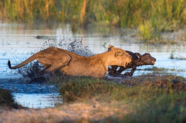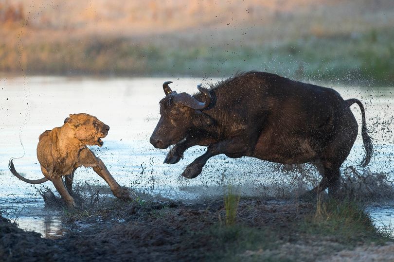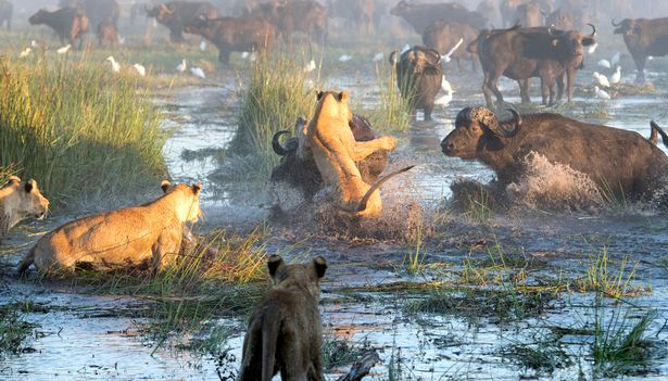 Đàn trâu đang tập trung uống nước tại một hố bùn ở Botswana, miền Nam Châu Phi mà không hề biết rằng mình đang bị theo dõi bởi những kẻ săn mồi - đàn sư tử gần đó. Một cuộc chiến dữ dội đã xảy ra sau đó, và khoảnh khắc trâu mẹ bảo vệ nghé con đã được nhiếp ảnh gia, bác sĩ thú y Ben Cranke tình cờ ghi lại.