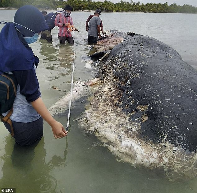 Con cá nhà táng trôi dạt bờ biển Indonesia. Ảnh: EPA