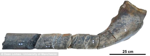 Nhà khoa học Lomax và Giáo sư Massare xác định, hóa thạch khổng lồ này là mẩu xương không đầy đủ, thuộc một góc hàm dưới của một con thằn lằn cá ichthyosaur khổng lồ dài 26m, có kích thước tương đương cá voi xanh. Loài bò sát dưới nước này nằm trên đỉnh của chuỗi thức ăn hàng triệu năm trong thời kỳ Jura.