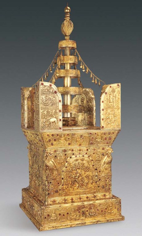 Chiếc rương cao 8cm được tìm thấy trong một quan tài bằng vàng và bạc cao 20cm. Quan tài được khóa ở bên trong một bảo tháp cao 117 cm và rộng 45 cm, chạm khắc tinh xảo.