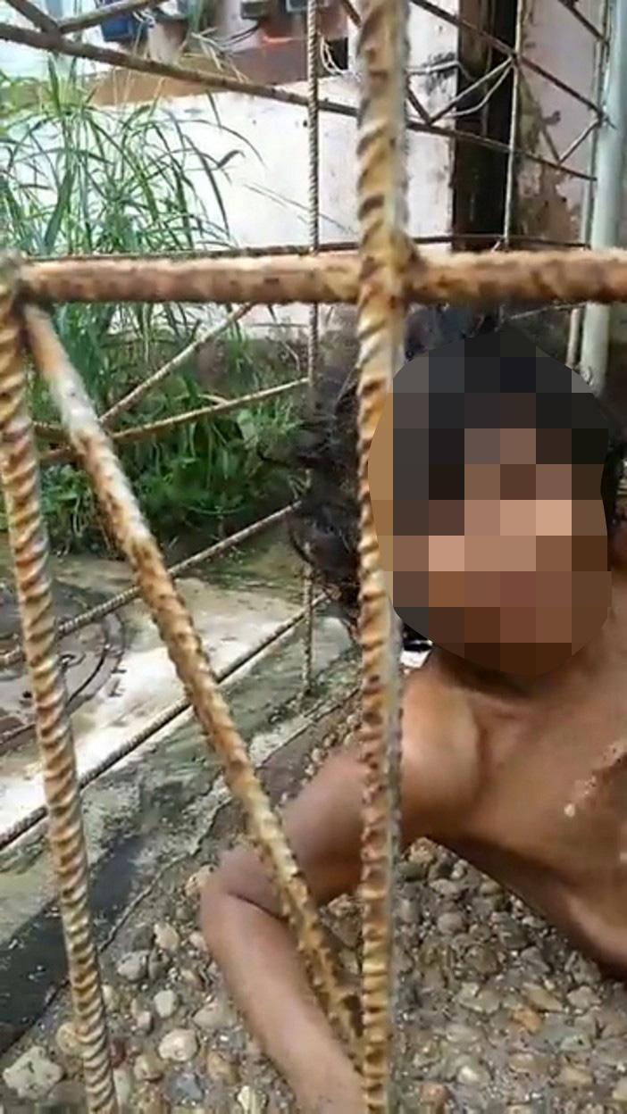 Không một mảnh vải che thân, người phụ nữ mắc bệnh tâm thần phân liệt bị nhốt trong một chiếc cũi sắt suốt 15 năm qua. Ảnh: The Sun