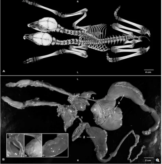 Kết quả khám nghiệm cho thấy con hươu có 2 trái tim cùng nằm trong 1 màng tim. Nó cũng có 2 hệ tiêu hoá riêng biệt nối liền với 1 hậu môn.
