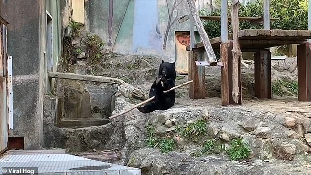 Trong đoạn clip dài 4 phút được quay lại bởi một du khách chưa rõ tên, chú gấu đen tên Claude đang ngồi trên bờ, xoay cây gậy bằng 2 tay của nó trong tiếng hò reo thích thú của du khách.