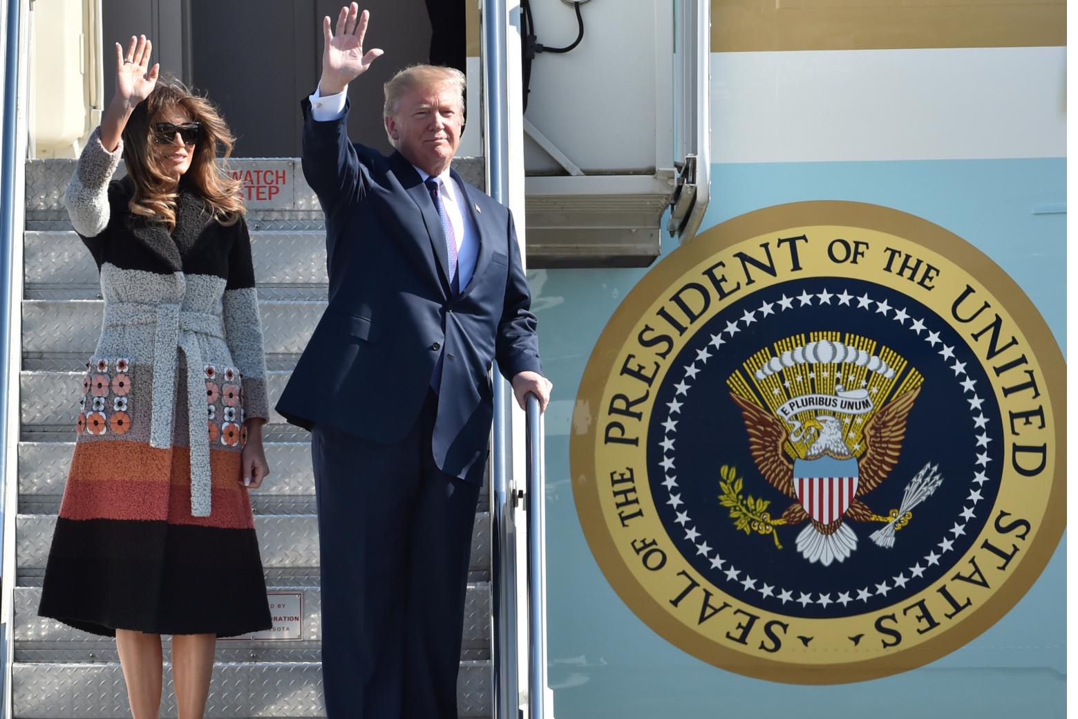 Đệ nhất phu nhân Melania Trump cùng Tổng thống Mỹ Donald Trump dừng chân tại Nhật Bản, điểm đến thứ hai trong chuyến công du Châu Á. Trong ảnh, bà bước ra từ chuyên cơ Air Force One trong trang phục áo khoác nhiều dải màu đính hoa của thương hiệu Italy, Fendi và giày của nhà thiết kế Tây Ban Nha, Manolo Blahnik.