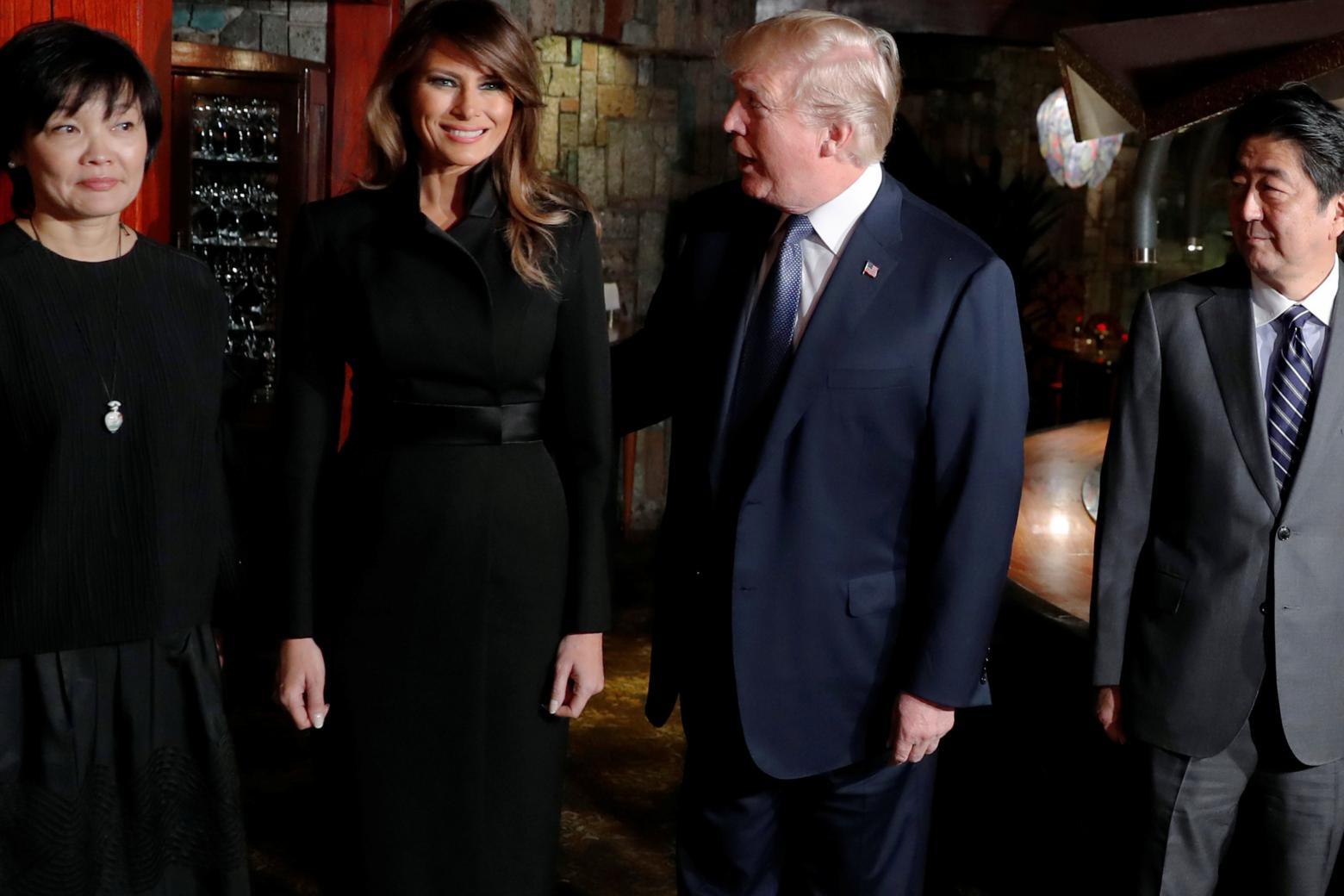 Bà lựa chọn chiếc áo khoác dài màu đen sang trọng khi cùng Tổng thống Trump thưởng thức bữa tối với Thủ tướng Nhật Bản Shinzo Abe và phu nhân Akie Abe tại nhà hàng Ginza Ukai Tei ở Tokyo. Chiếc váy đen có điểm nhấn là dải dây cùng màu ở thắt lưng, tạo vẻ sang trọng và quý phái.