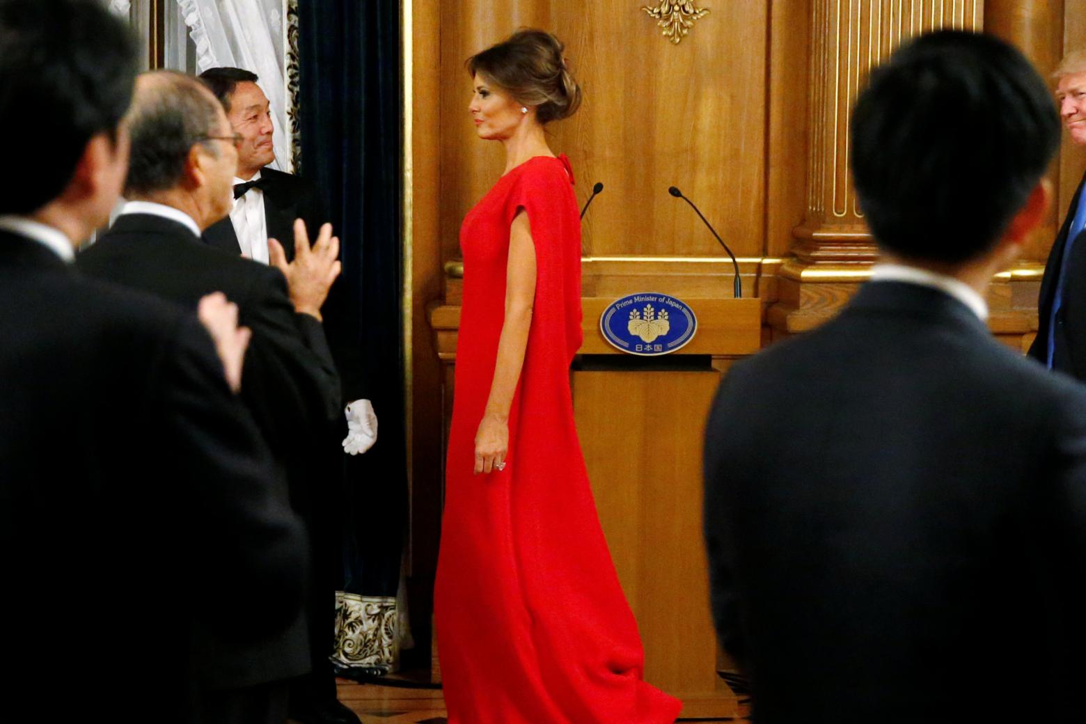 Khi diện kiến Hoàng đế Akihito và Hoàng hậu Michiko tại Cung điện Hoàng gia Tokyo vào ngày 6/11, bà Melania diện chiếc váy màu xanh navy của nhãn hiệu Dior. Đệ nhất phu nhân sau đó tham dự một lớp học thư pháp tại trường tiểu học.