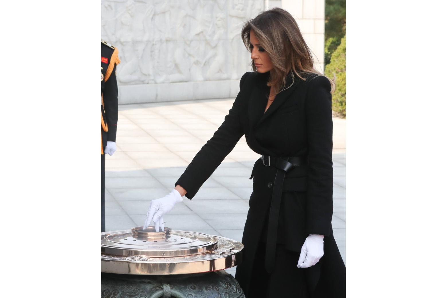 Tại điểm dừng chân tiếp theo là Seoul, Hàn Quốc, đệ nhất phu nhân Mỹ mặc chiếc áo khoác màu tối được thiết kế bởi Delpozo, một thương hiệu đến từ Tây Ban Nha, kết hợp cùng giày cao gót màu xanh lam. Chiếc váy tạo vẻ quyền lực nhưng không kém phần thu hút cho bà Melania.