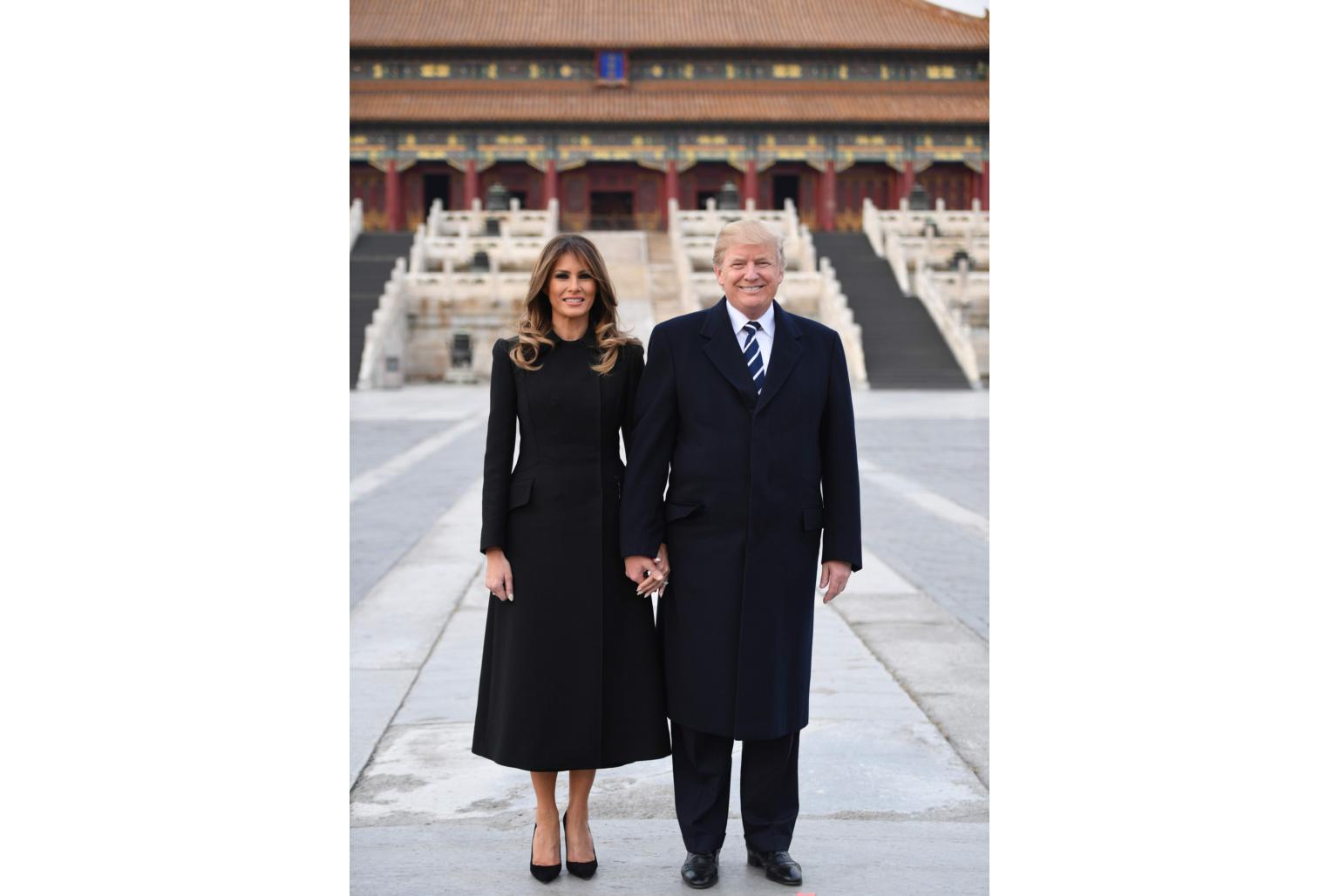 Tổng thống Donald Trump cùng phu nhân tay trong tay cùng nhau tham quan Tử Cấm Thành ở Bắc Kinh, Trung Quốc. Tại điểm dừng chân cuối của mình, bà đã lựa chọn phong cách khá an toàn với trang phục màu đen quen thuộc.