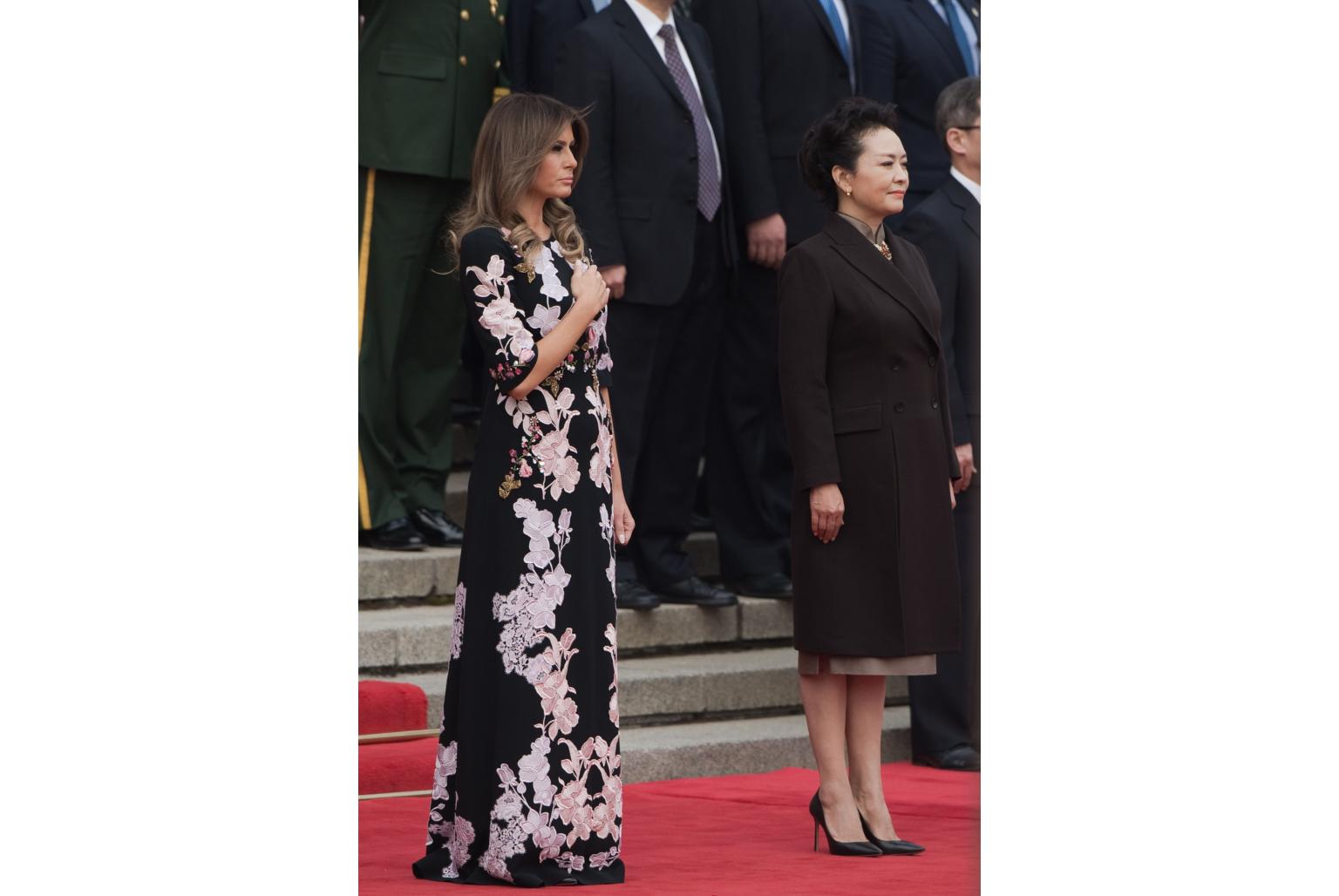 Trong một buổi lễ chào đón tại Đại lễ đường Nhân dân vào ngày 9/11, đệ nhất phu nhân Mỹ khá nổi bật trên nền thảm đỏ với chiếc váy hoa màu đen trắng của Dolce & Gabbana. Chiếc váy này hoàn toàn được thêu tay và có giá 3.000 USD. Bộ trang phục cùng kiểu tóc khiến bà Melania nữ tính và dịu dàng hơn.