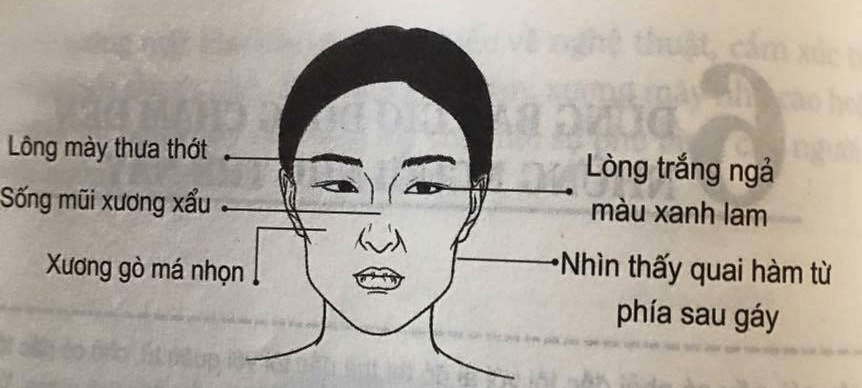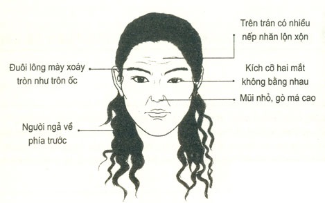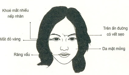 Theo nhân tướng học, ấn đường hẹp, lại có vết sẹo là tướng của người đa nghi. Bên cạnh đó, nữ giới có mắt đỏ vàng, hàm răng vẩu lại thêm khóe mắt nhiều nếp nhăn là tướng của người nóng nảy, ngoan cố, dễ bị kích động.
