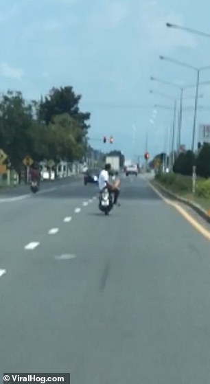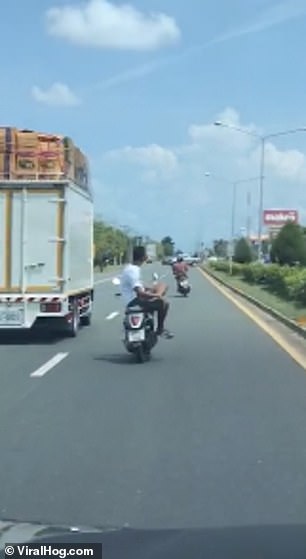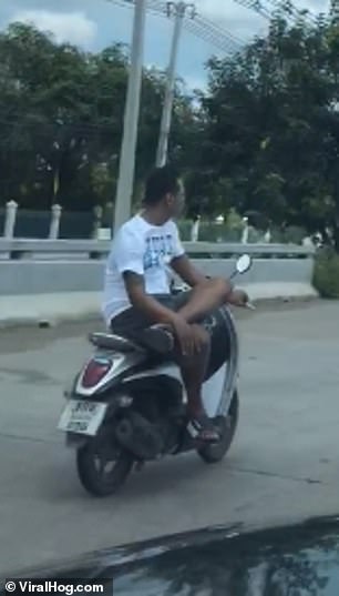 Trong đoạn clip ghi lại vào ngày 8/10, Sitaban bật cười khi thấy “quái xế” ung dung lái xe trên đường theo cách chả giống ai. Một người đi xe máy khác cũng phải bật ngón tay cái khen ngợi sự liều mạng và phong cách quái đản của anh chàng.