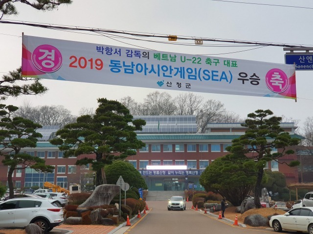 Quận Sancheong từng treo biểu ngữ chúc mừng thầy Park sau khi ông đưa đội tuyển Việt Nam đoạt chức vô địch Giải AFF Cup 2018.