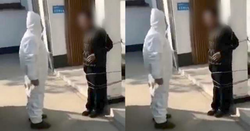 Trong đoạn clip được quay tại thành phố Bộc Dương, tỉnh Hà Nam (Trung Quốc), một người đàn ông mặc áo đen bị trói chặt vào cột, đối diện là nhân viên đội tự quản trong bộ đồ bảo hộ. Chỉ liếc mắt qua trong phút chốc, ai cũng có thể nhận ra sự đối lập rõ rệt giữa hai người: một che kín từ đầu đến chân, người còn lại chẳng có lấy một món đồ để bảo vệ bản thân mình trước dịch bệnh.