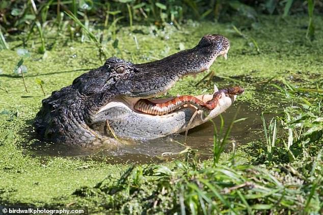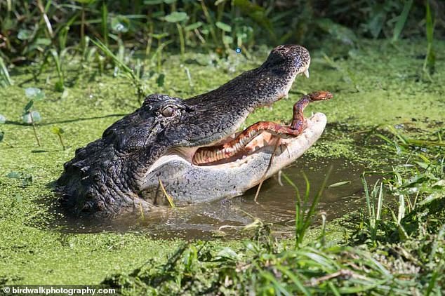 Cuối tuần trước, khi đến thăm Khu bảo tồn Circle B ở Lakeland, bang Florida (Mỹ), vợ chồng nhiếp ảnh gia Jesse và Linda Waring trông thấy con rắn màu nâu cam đang cố hết sức để thoát khỏi hàm cá sấu.