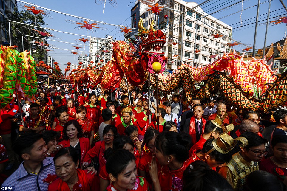 Các nghệ sĩ biểu diễn tiết mục múa rồng đang đi diễu hành quanh khu phố Tàu ở Yangon, Myanmar.