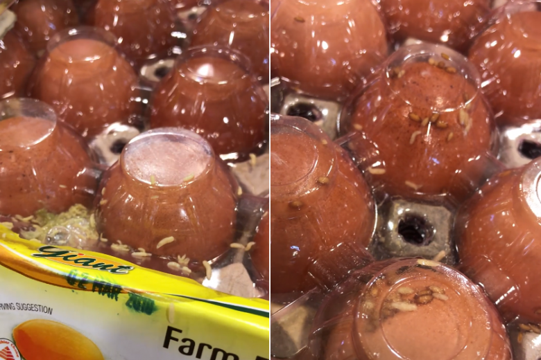 Giòi từ trong những khay trứng tại siêu thị Giant, Singapore.