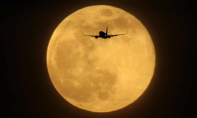 Một máy bay bay ngang trước siêu trăng ở London ngày 19/2. Ảnh: Getty Images.