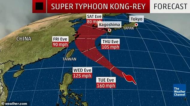 Nhà khí tượng học Rob Richard cho biết: “Sau khi đe dọa quần đảo Ryukyu, siêu bão Kong-rey được dự đoán sẽ tấn công vào Đài Loan hoặc phía đông Trung Quốc. Nó cũng có thể đổ bộ trực tiếp về phía tây bắc Nhật Bản hoặc bán đảo Triều Tiên”.