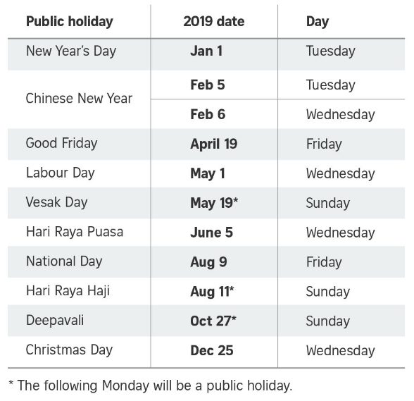Các ngày nghỉ quốc gia ở Singapore năm 2019. (Ảnh: Straits Times)