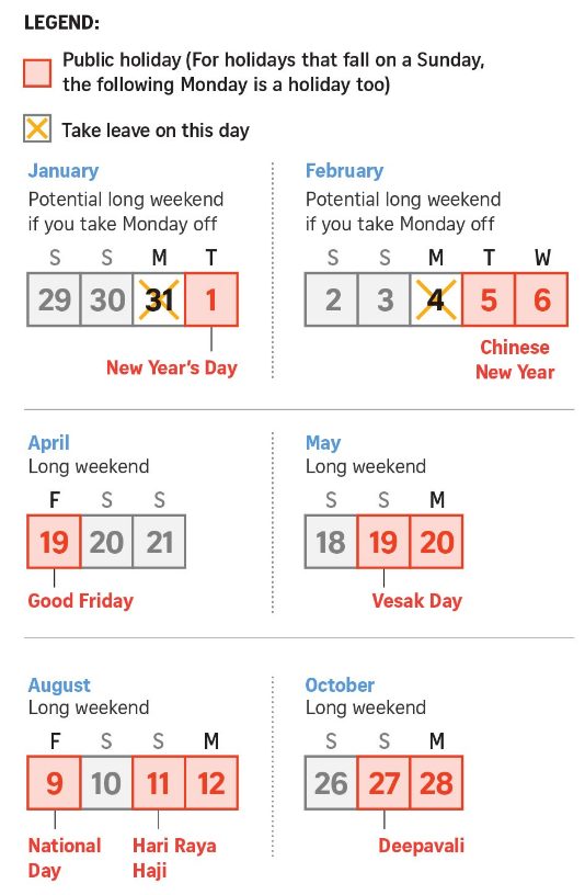 Báo Singapore “bày kế” để người dân kéo dài các kỳ nghỉ trong năm. Theo kế hoạch này người dân nên nghỉ phép vào các này ở giữa ngày nghỉ và ngày cuối tuần.