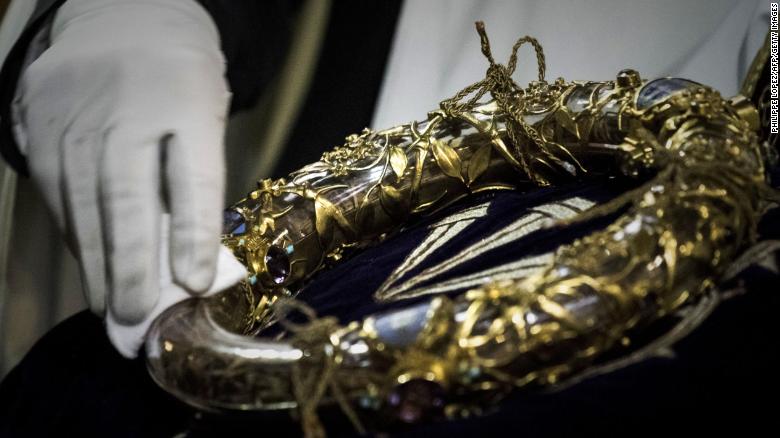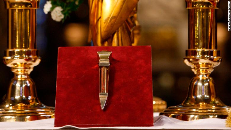 Một cái đinh từ thập giá mà Chúa Giêsu bị đóng đinh được lưu giữ trong nhà thờ Đức Bà. Ảnh CNN