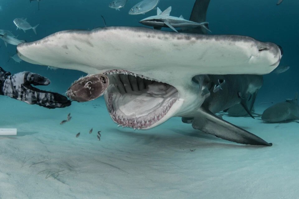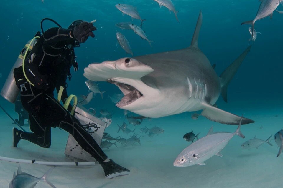 Loạt ảnh “sởn tóc gáy” cho thấy người thợ lặn đang dùng cá đông lạnh làm mồi cho đàn cá mập đầu búa dài gần 5 m. Thậm chí, một trong số họ còn lướt nhẹ tay qua làn da của con vật khổng lồ, chỉ cách khoang miệng đáng sợ của nó vài cm.