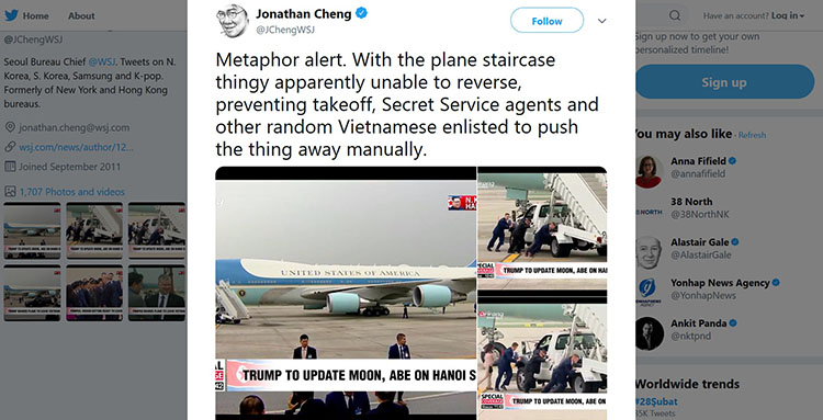 Nhiều phóng viên phương Tây chia sẽ loạt ảnh cho thấy chiếc thang dẫn lên chuyên cơ Không lực Một chở Tổng thống Donald Trump về Mỹ bị hỏng nên một số mật vụ của Mỹ và nhân viên an ninh sân bay của Việt Nam đã hợp sức dùng tay đẩy chiếc thang ra khỏi cửa của máy bay. Chiếc tháng do phía Mỹ mang đến sân bay Nội Bài và một nguồn tin từ sân bay cho biết đây là sự cố hy hữu.