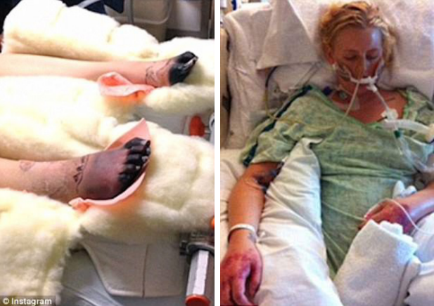 Những hình ảnh về Wasser vào thời điểm mới nhập viện năm 2012. Cô khi đó sốt tới 41 độ C, hai chân bị nhiễm trùng đến thâm đen lại và phải hứng chịu những cơn đau tim liên tục.