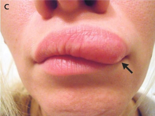 “Khối u” di chuyển xuống phía dưới khiến môi của người phụ nữ bị sưng phồng.